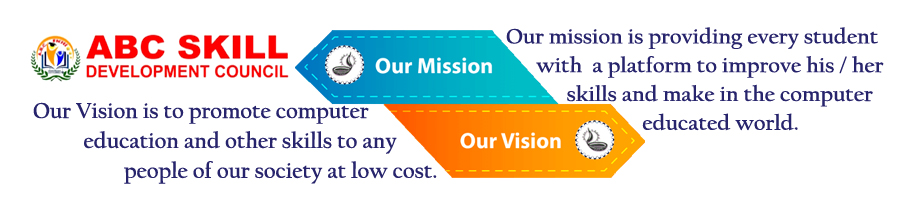 ‘ABC SKILL DEVELOPMENT COUNCIL’ has Launched/started various self design short & long terms latest job oriented & Skill Advancement computer education, Basic Instructor training, Skill Advancement training certificates & Diploma Courses in non formal education sector to help the candidate in getting jobs in different field and that to at a very low fee. So that the candidates can engage in service and get self- employment by becoming successful entrepreneurs in the present era of competition.