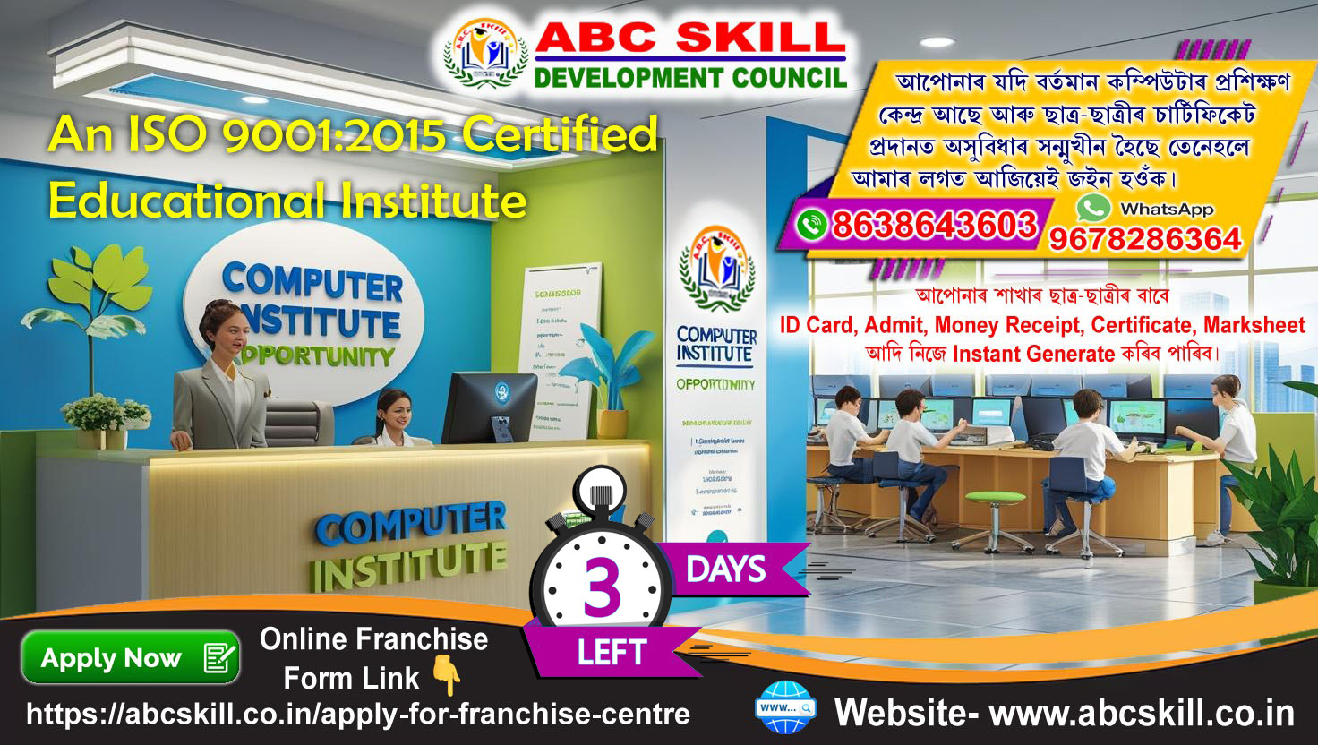 | বৰ্তমান আমি ABC SKILL DEVELOPMENT COUNCIL এ অসমৰ প্ৰতিখন জিলাৰ সকলো ঠাইতে পুনৰ Authorized Computer Education Centre মুকলি কৰিব বিচাৰিছো। গতিকে, ইচ্ছুক ব্যক্তি/বৰ্তমান চলি থকা কম্পিউটাৰ কেন্দ্ৰসমুহে আমাক অনলাইন আবেদন কৰিব পাৰে। অন্যথা, WhatsAppৰ জৰিয়তেও সবিশেষ জানিব পাৰে। |